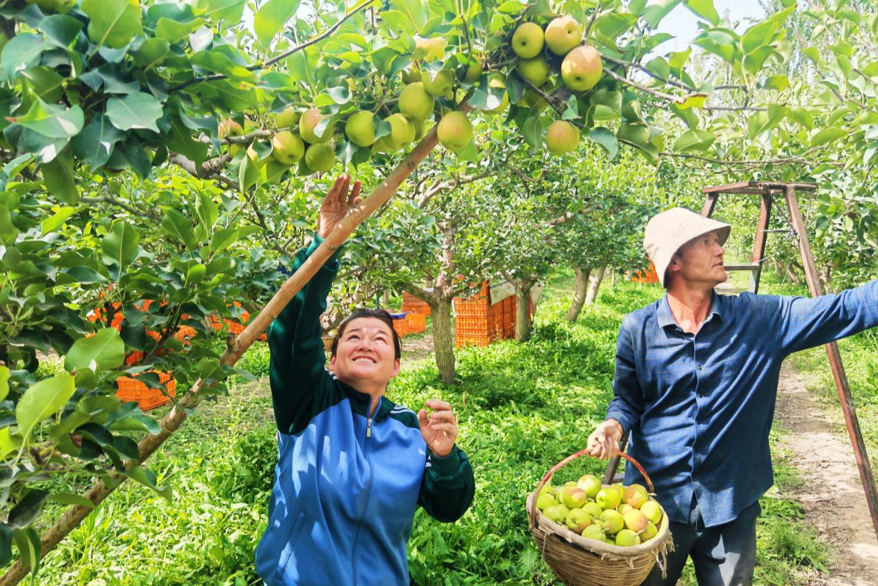 9月10日,在库尔勒市库尔楚园艺场的一片梨园里,泛着红晕的香梨挂满枝头,处处弥漫着成熟的香气,果农们正在采摘库尔勒香梨,从采摘到分拣再到装运,各环节分工明确、衔接顺畅,金黄的梨园里处处是热火朝天的劳动场景,也映照着果农们丰收的喜悦。